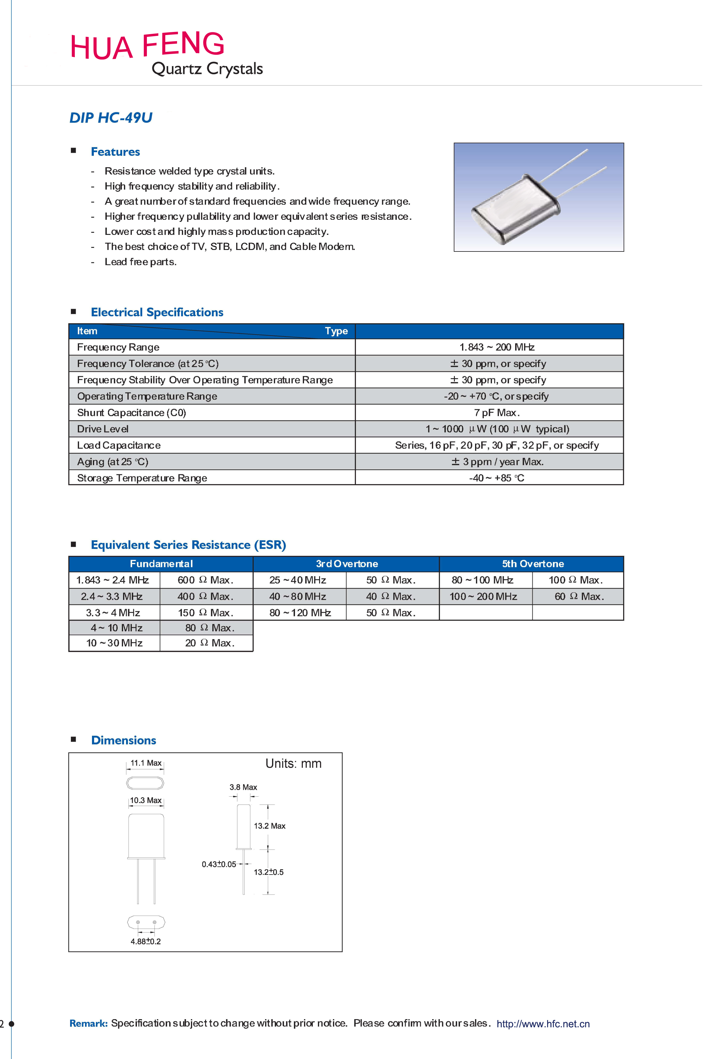 石英晶體諧振器  49u dip   Resistance welded type crystal units   13.2*10.*3.8  1.700MHZ~125.000MHZ yes