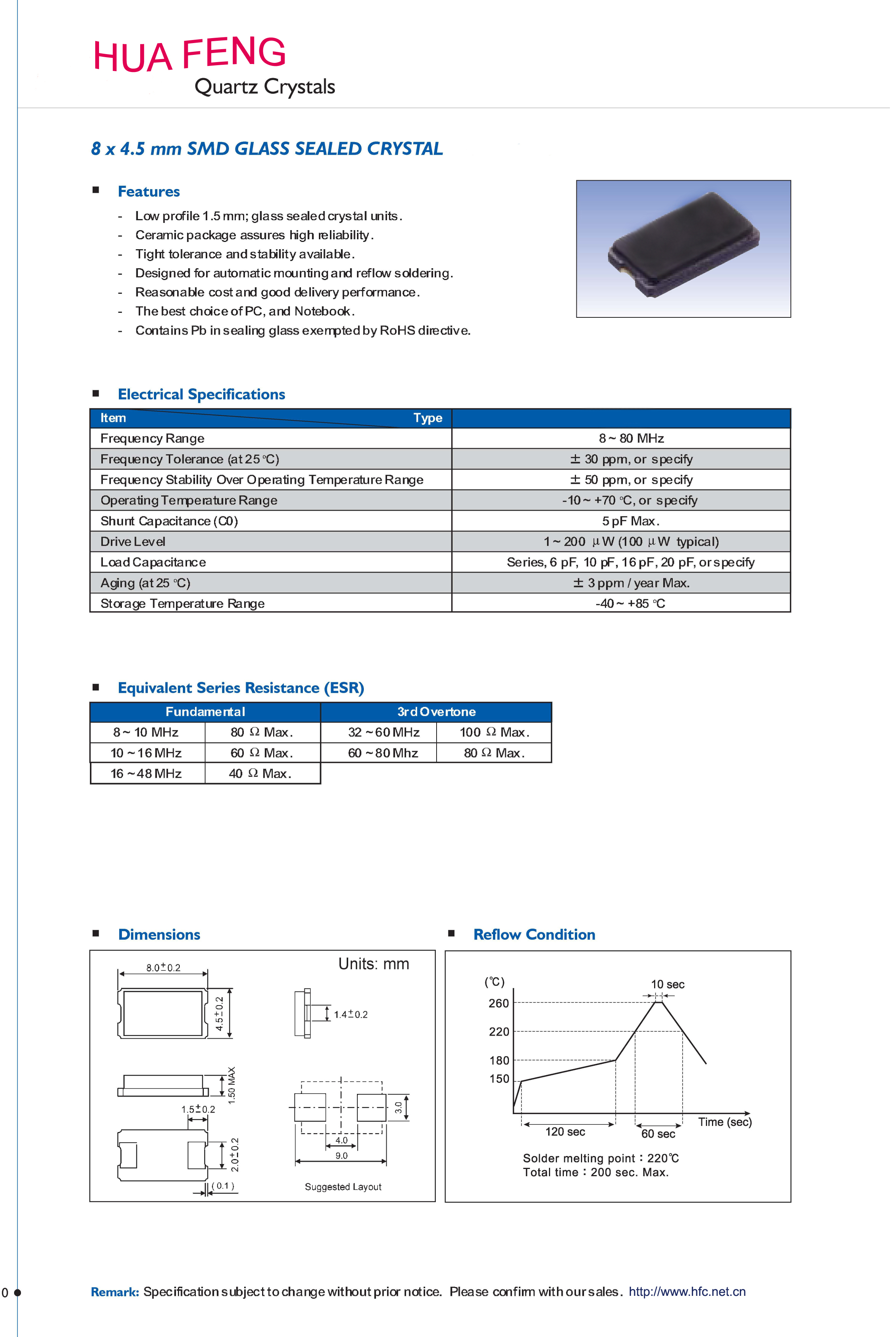 石英晶體諧振器  8045 Glass 2pad   Low profile 1.5mm;glass sealed crystal units   8.0*4.5*1.5  8.000MHZ~80.000MHZ yes